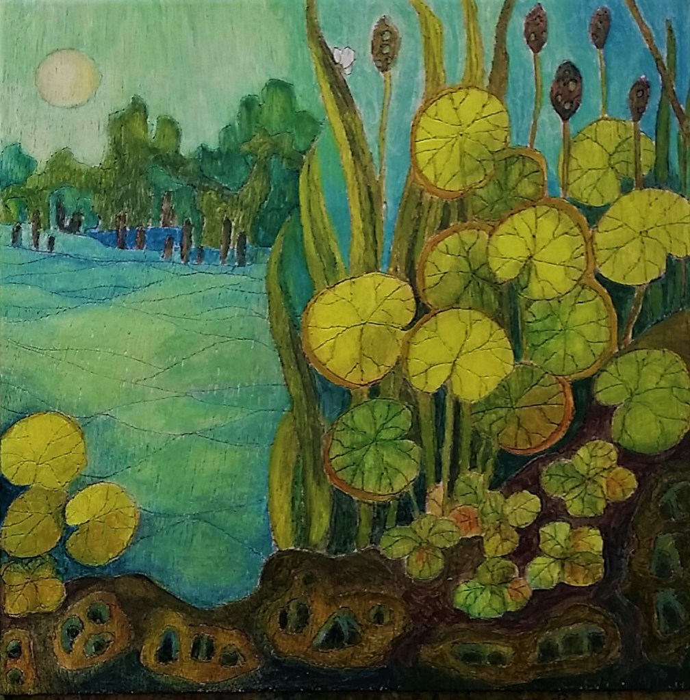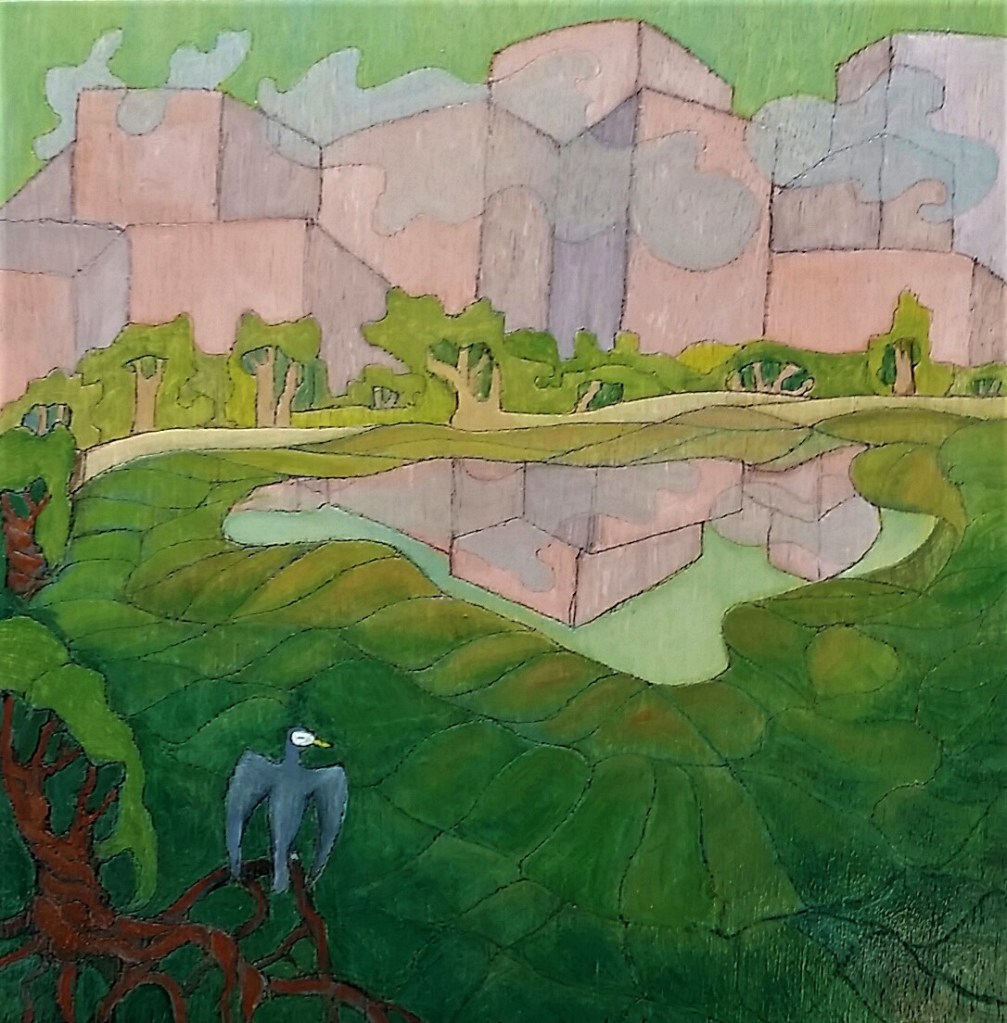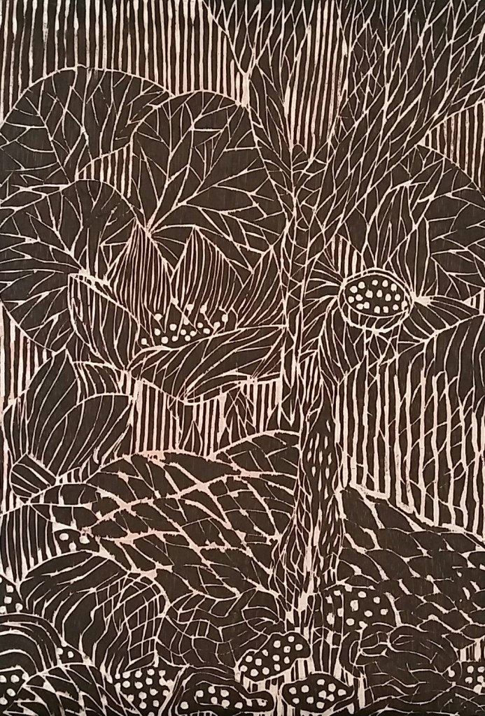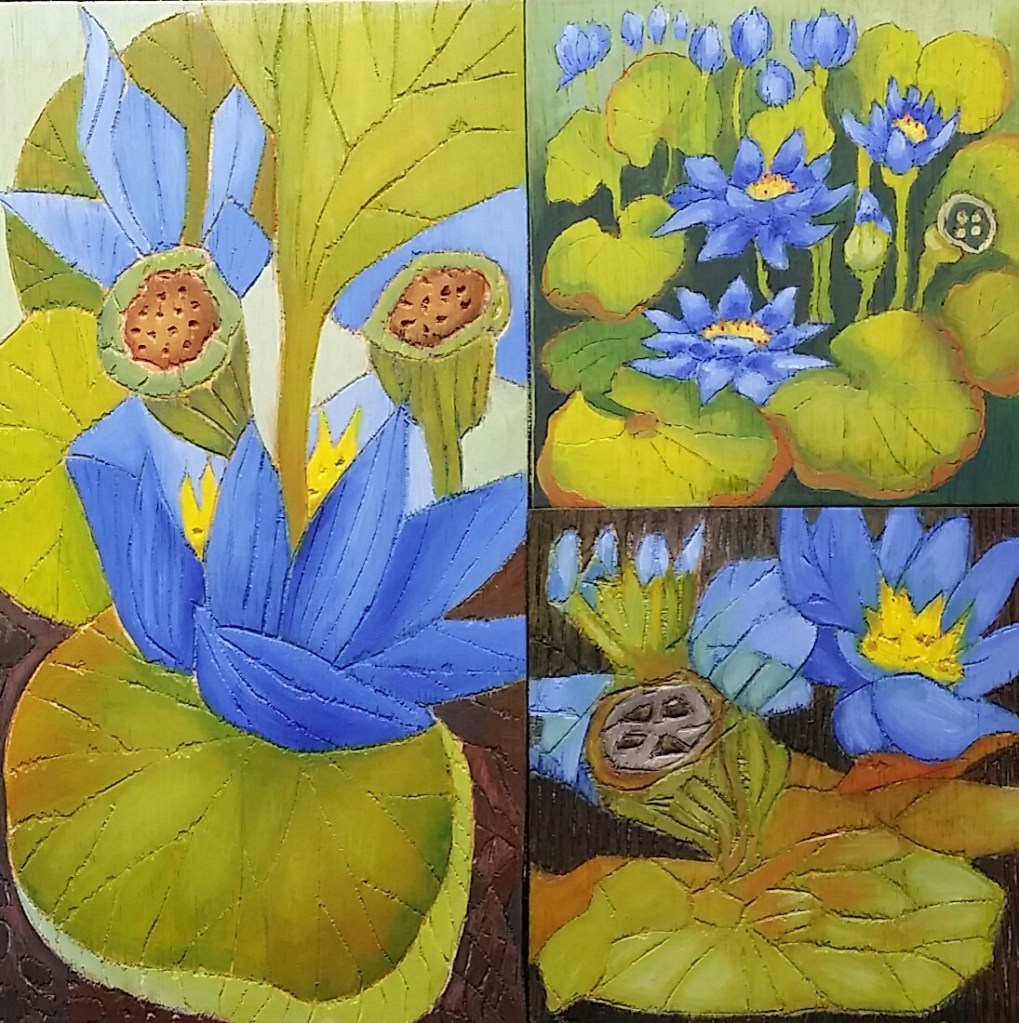 Beatrice Weidner, Cooks River I, 2023. Oil on engraved wood, 30 X 30cmBeatrice Weidner, Cooks River II, 2023. Oil on engraved wood, 30 x 30cmBeatrice Weidner, Cooks River III, 2023. Oil on engraved wood, 30 x 30cmBeatrice Weidner, Central Park 1, 2023. Oil on engraved wood, 30 x 30cmBeatrice Weidner, Pankaja – Blue Lotus, 2023. Oil on three woodcut blocks.Beatrice Weidner, Pankaja, 2023. Woodblock print, 70 x 55cm